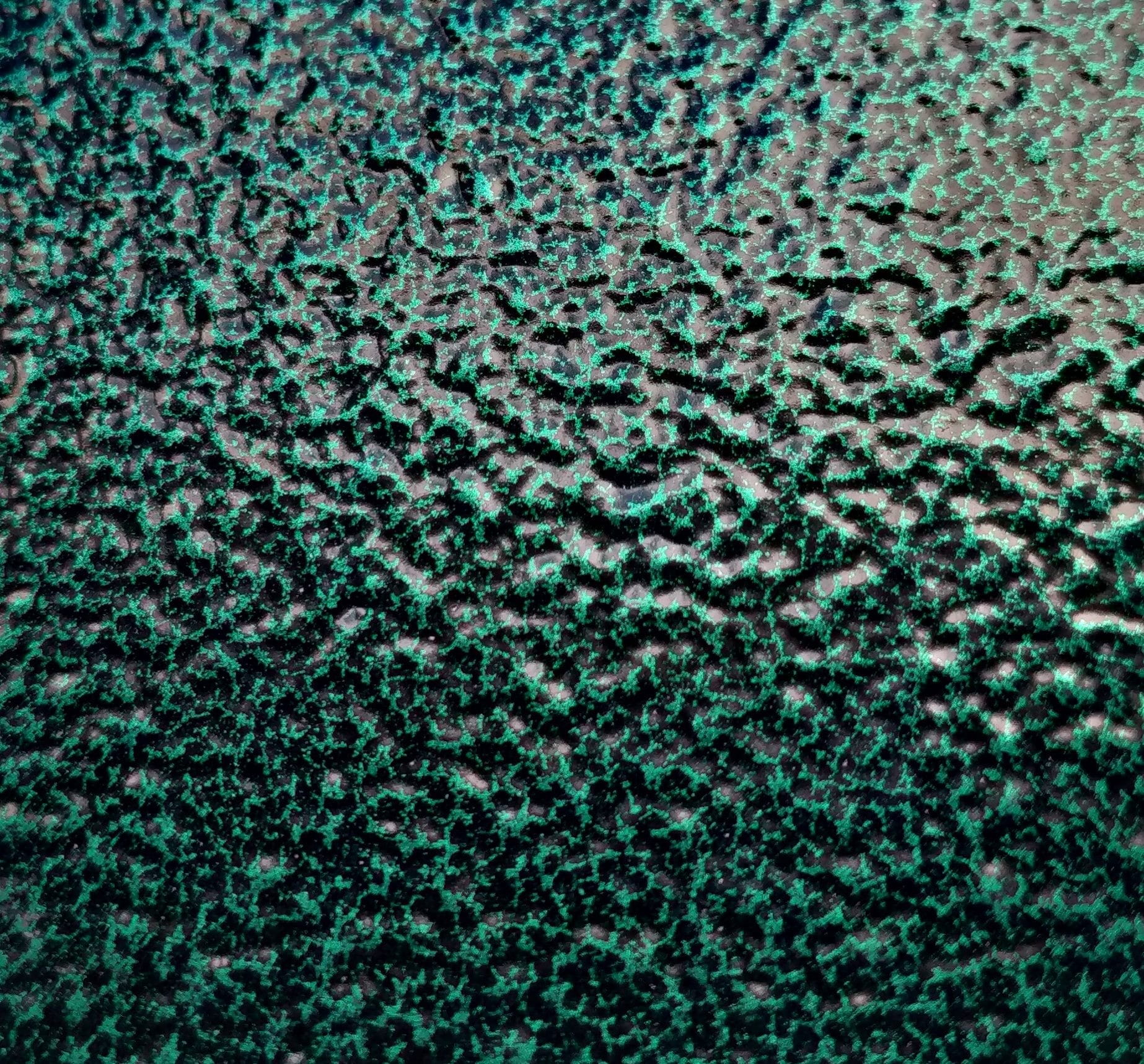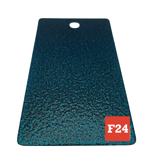 Peinture en poudre à surface ondulée, avec des dépressions caractéristiques et une veine colorée sur une base noire. L'effet imite la surface d'un objet ancien. Souvent utilisé pour donner
